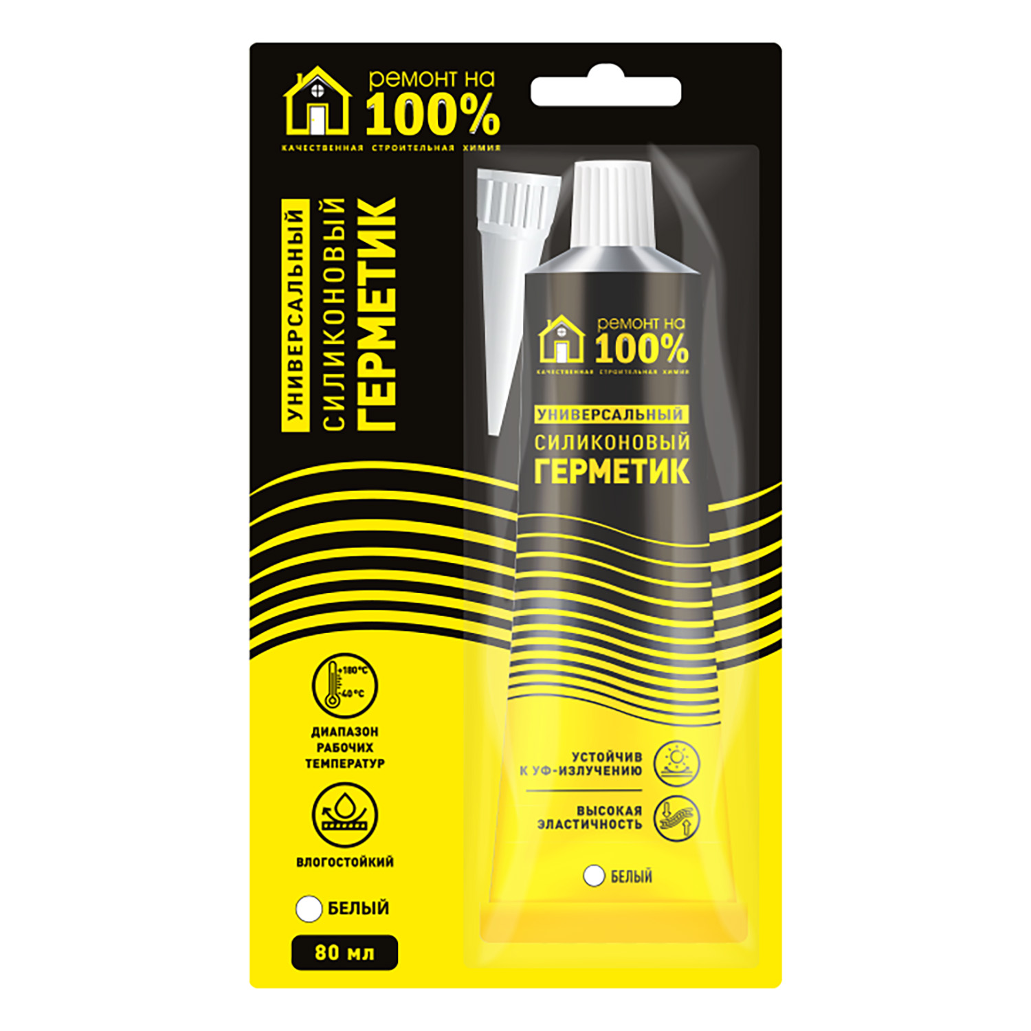 Герметик силиконовый «Ремонт на 100%» белый 80 мл — универсальный силиконовый герметик для широкого спектра строительных и общих ремонтных работ внутри и снаружи помещений. Обладает отличной адгезией к стеклу, дереву, керамике, пластику и т. д. Образует долговечный эластичный, устойчивый к влаге и УФ-лучам шов.