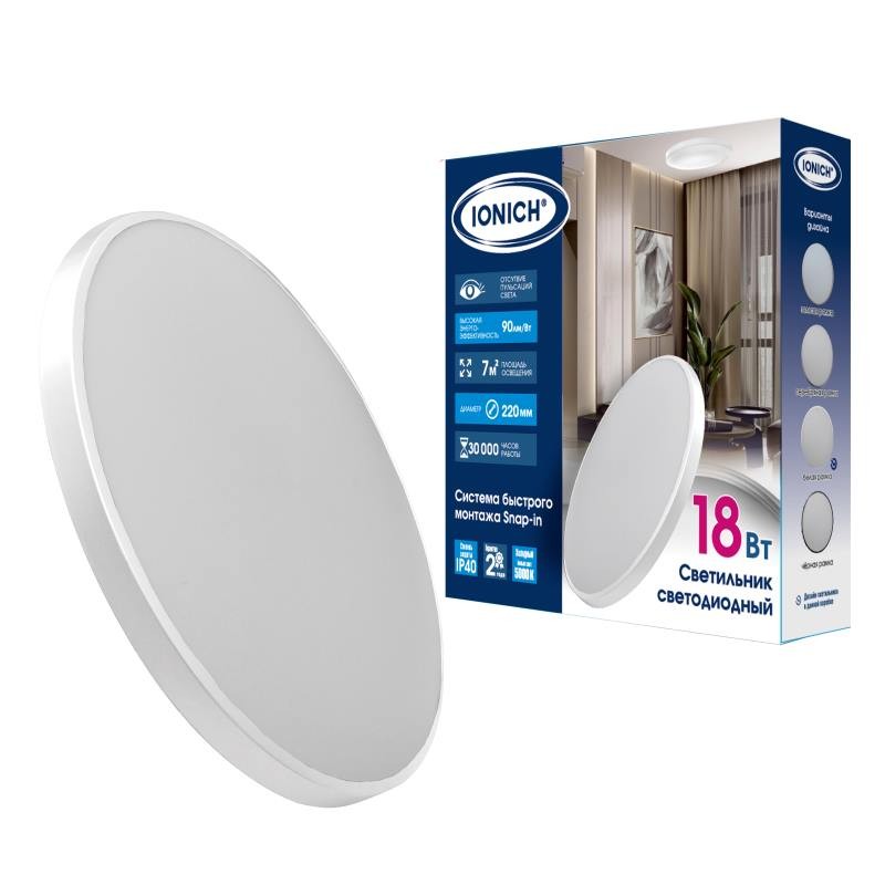Светильник светодиодный акриловый 220мм IONICH "Snap In"18Вт 5000К 1620Лм IP40 белый S=7м2 2695*1/20