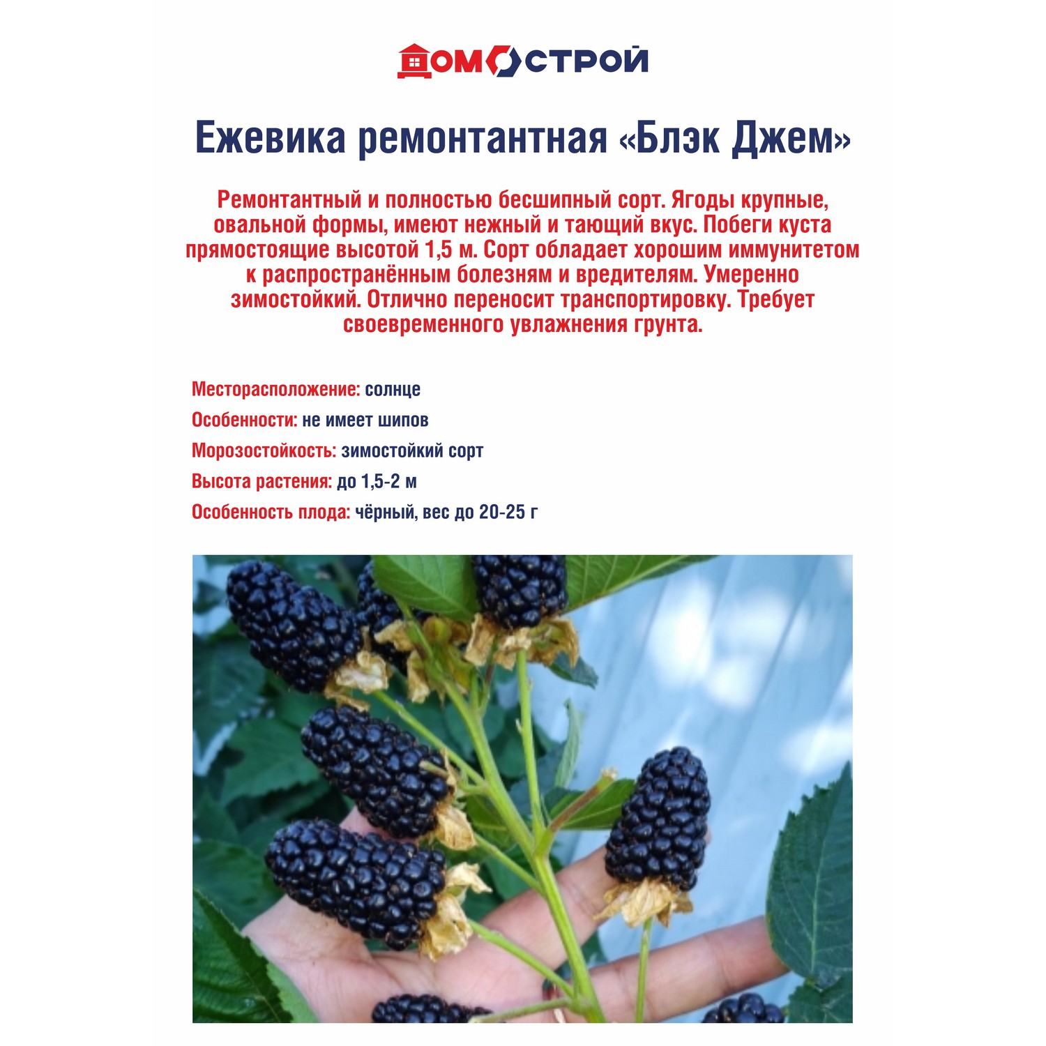 Ежевика Блэк Джем (Black Gem) ремонтантный и полностью бесшипный сорт. Ягоды крупные, овальной формы, имеют нежный и тающий вкус. Побеги куста прямостоящие, высотой 1.5 м. Сорт обладает хорошим иммунитетом к распространенным болезням и вредителям. Умеренно зимостойкий. Отлично переносит транспортировку. Требует своевременного увлажнения грунта.