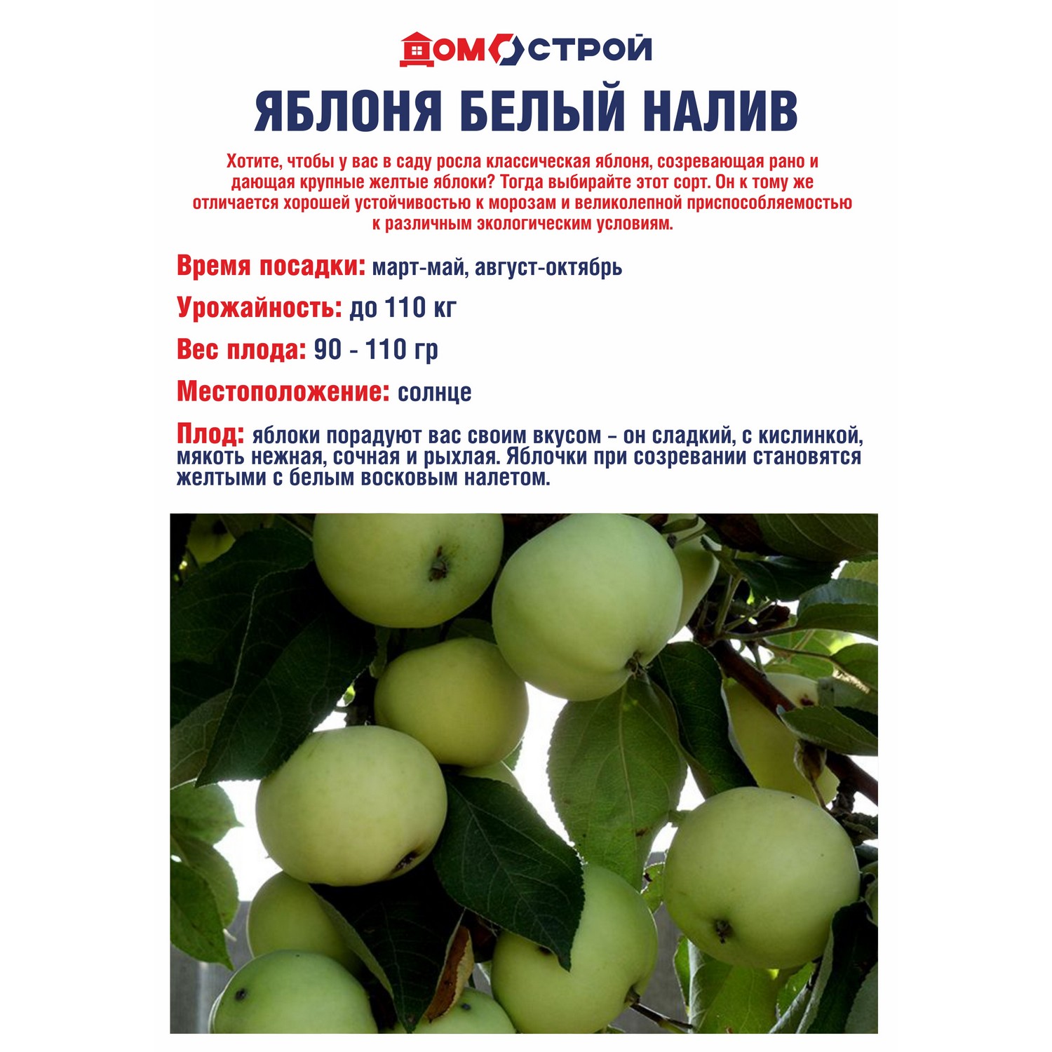 Этот сорт отличается хорошей устойчивостью к морозам и великолепной приспособляемостью к различным экологическим условиям. Сам сорт относится к ранним летним сортам, и созревают яблоки уже во второй половине августа. Яблоки порадуют вас своим вкусом – он сладкий, с кислинкой, мякоть нежная, сочная и рыхлая.