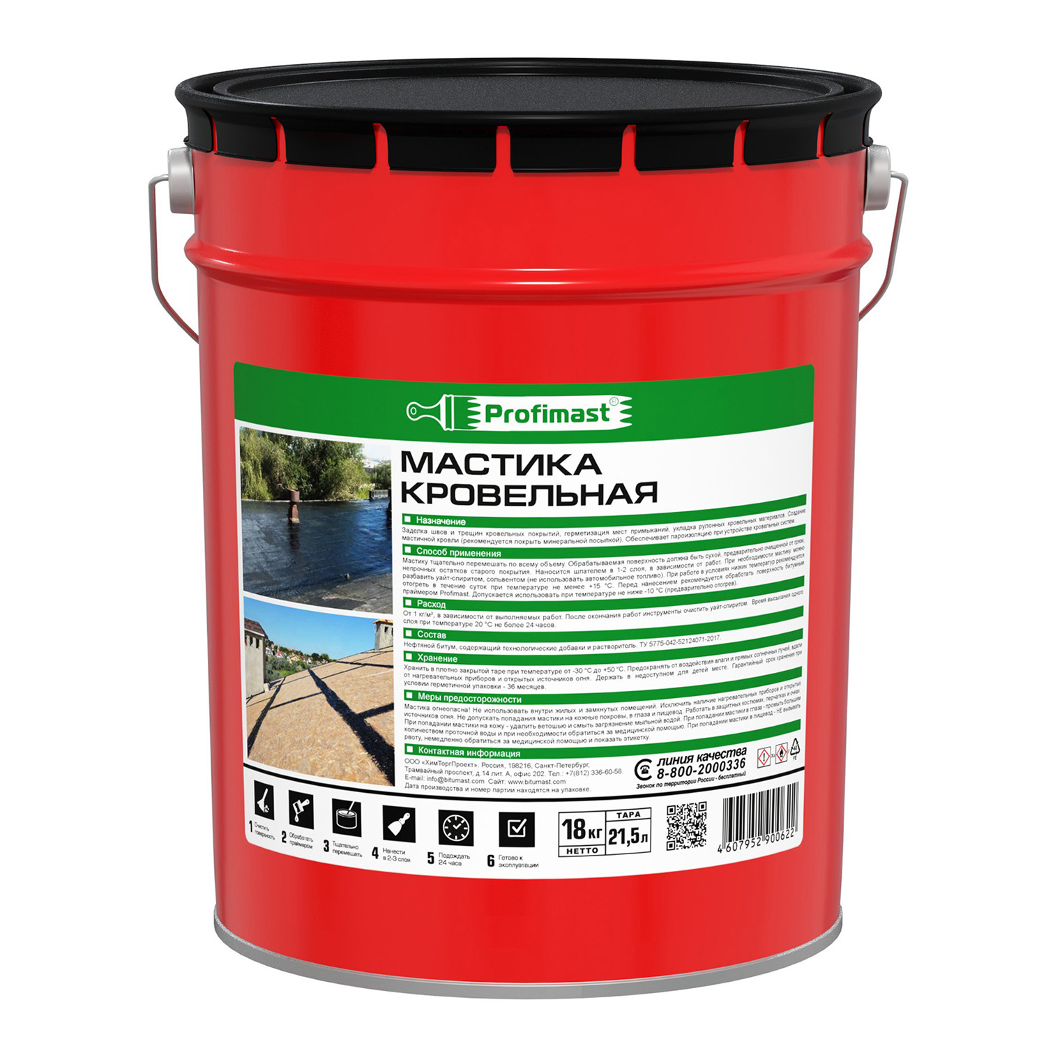 Мастика битумная кровельная Profimast 21.5 л — состав на основе высококачественного кровельного битума. Обладает густой консистенцией, не растекается в горизонтальных швах и трещинах. Содержит гербицидную добавку, препятствующую прорастанию сорняков, мхов и лишайников в кровельном полотне. Совместима с большинством битумных и битумно-полимерных материалов. Не содержит толуола и других токсичных растворителей.