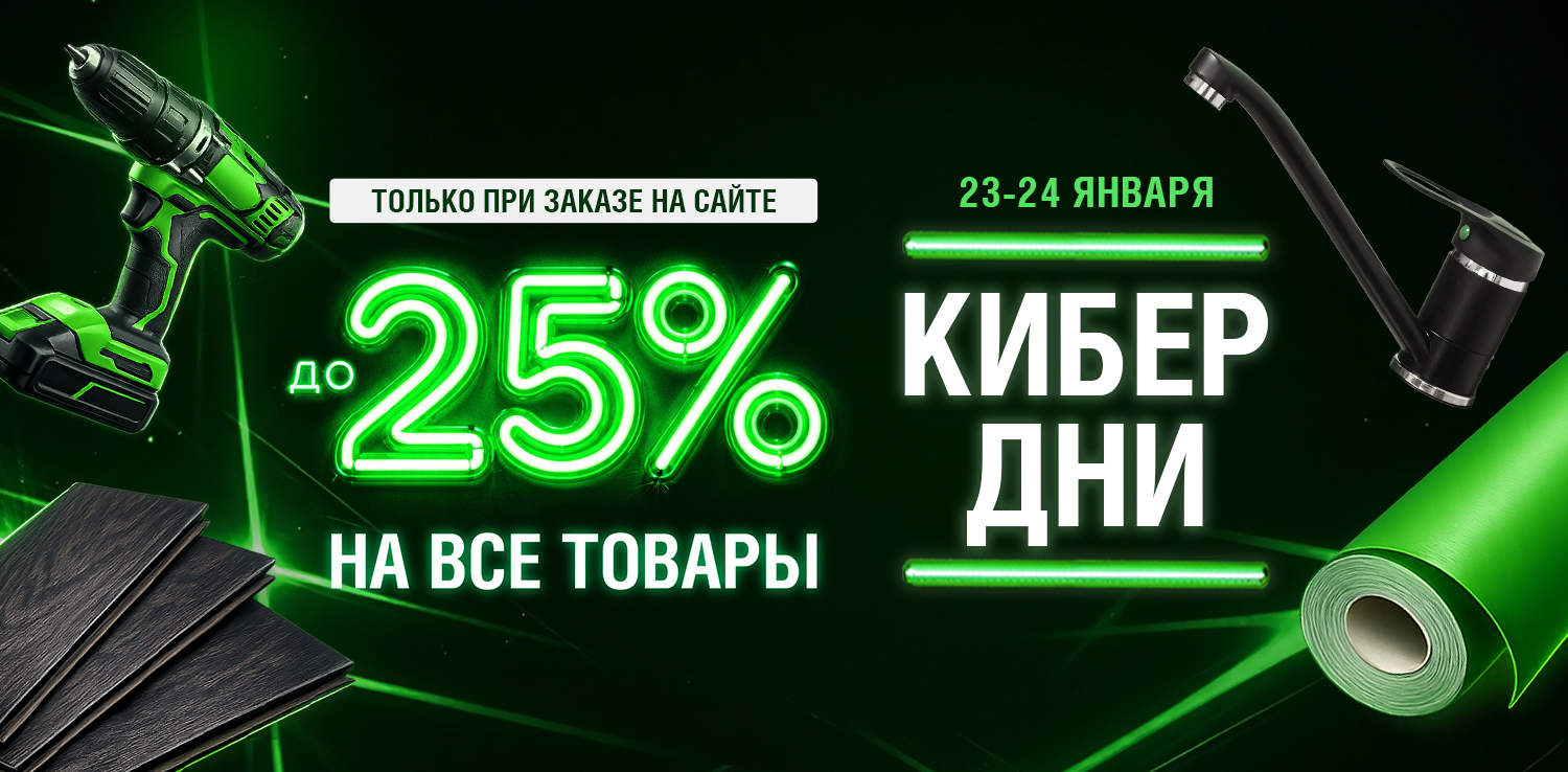 КИБЕРдни в сети ДомоСтрой! Только 2 дня — 23 и 24 января при заказе на сайте скидка до -25% на огромный ассортимент товаров. Это отличная возможность приобрести напольные покрытия, обои, люстры, инструменты, двери, товары для дома и многое другое по привлекательным ценам! Оформляйте заказы в дни акции со скидкой и забирайте в течение 3 дней после.