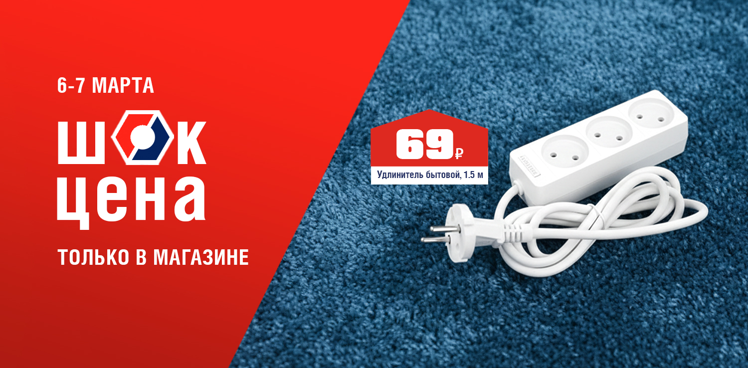 Устали искать свободную розетку? Удлинитель с тремя гнездами подарит свободу вашей технике. Компактный, надежный, выдерживает нагрузку до 2.2 кВт. Подключайте мощные приборы без страха за проводку. 6 и 7 марта в розничных магазинах ДомоСтрой не пропустите ШОК-цену: